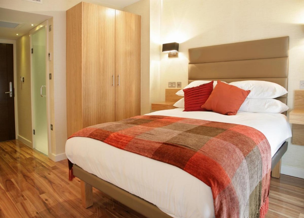 This room features a wooden floor and is equipped with a kitchenette and an private bathroom. It also includes a TV with integrated DVD player.